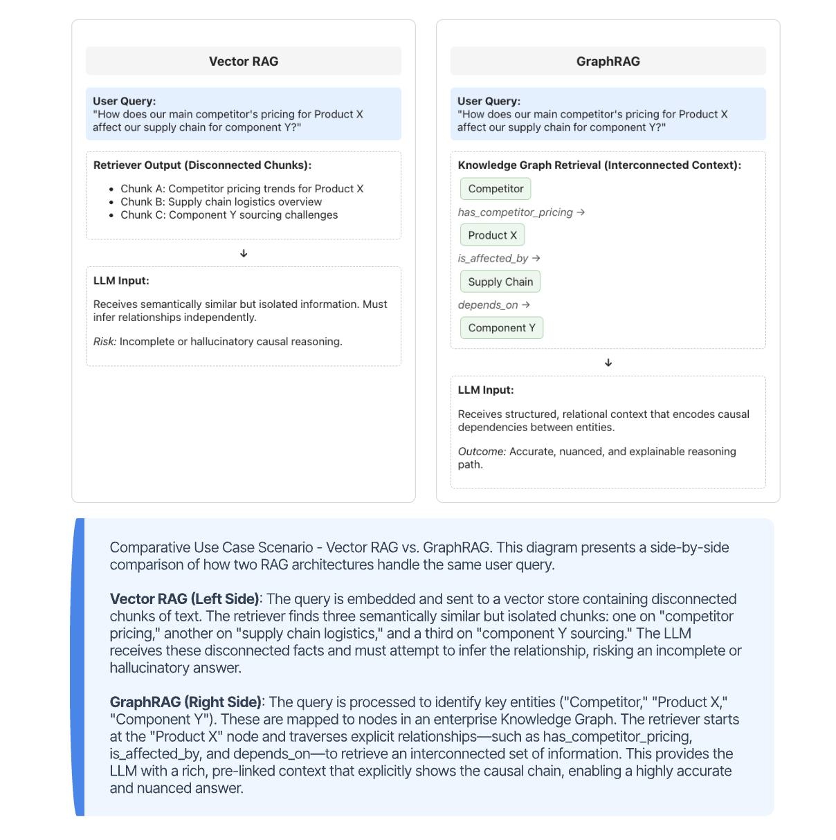 A primary limitation of standard vector-based RAG is its inability to comprehend the relationships between pieces of information. It struggles with queries that require multi-hop reasoning or an understanding of a global knowledge structure. GraphRAG addresses this by using a knowledge graph as the retrieval backbone, modeling information as a network of entities and their relationships. This allows an agent to answer complex questions by traversing the graph, gathering a far more comprehensive and contextually rich set of information than a standard similarity search could provide. The figure below provides an example of such a scenario as compared to traditional RAG.