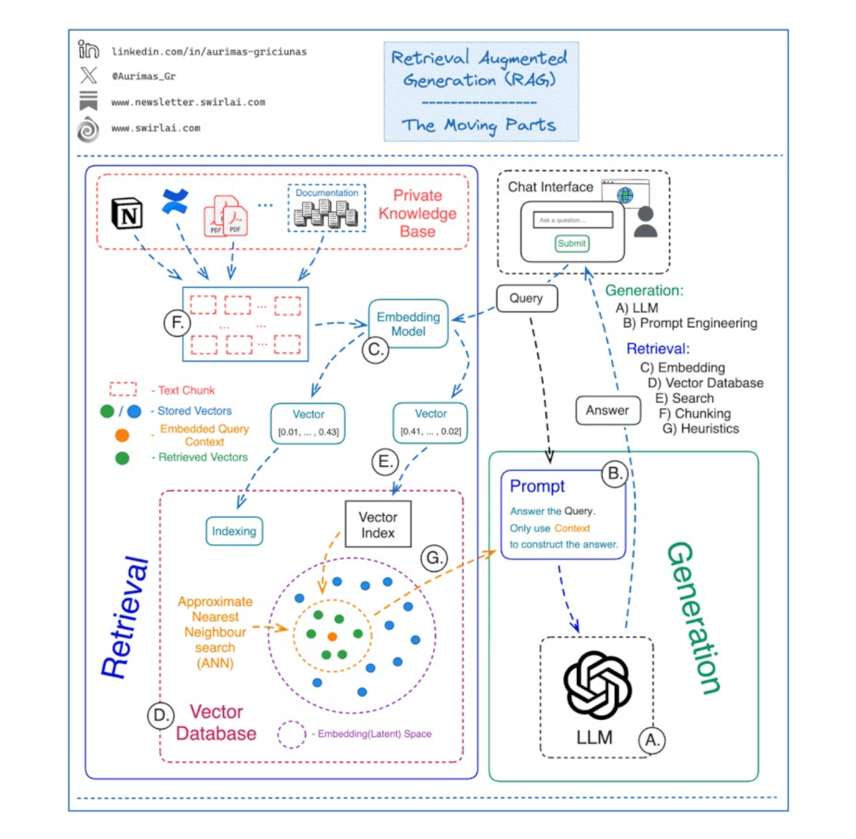 - An Ingestion & Preprocessing Layer connects to these sources. This layer performs three key steps: Parsing (extracting text and structure), Cleaning (removing irrelevant artifacts), and Chunking (breaking documents into smaller, semantically coherent pieces).
