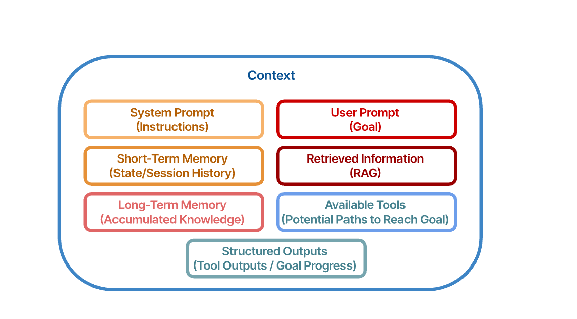 As illustrated in the figure above, the context window of an effective agentic system is a dynamic synthesis of several critical information sources. It is anchored by the System Prompt, which provides the core operational instructions, and the User Prompt, which defines the current objective. Situational awareness is maintained through Short-Term Memory, capturing the immediate session history and state. The agent's potential actions are represented by the Available Tools, outlining the paths it can take to achieve the goal. To ensure informed decision-making, this context is enriched with accumulated knowledge drawn from Long-Term Memory and dynamically Retrieved Information (e.g. via RAG). Finally, Structured Outputs from previous actions are included, enabling the agent to track its progress and plan subsequent steps iteratively. The careful orchestration of these elements is the essence of effective context engineering.