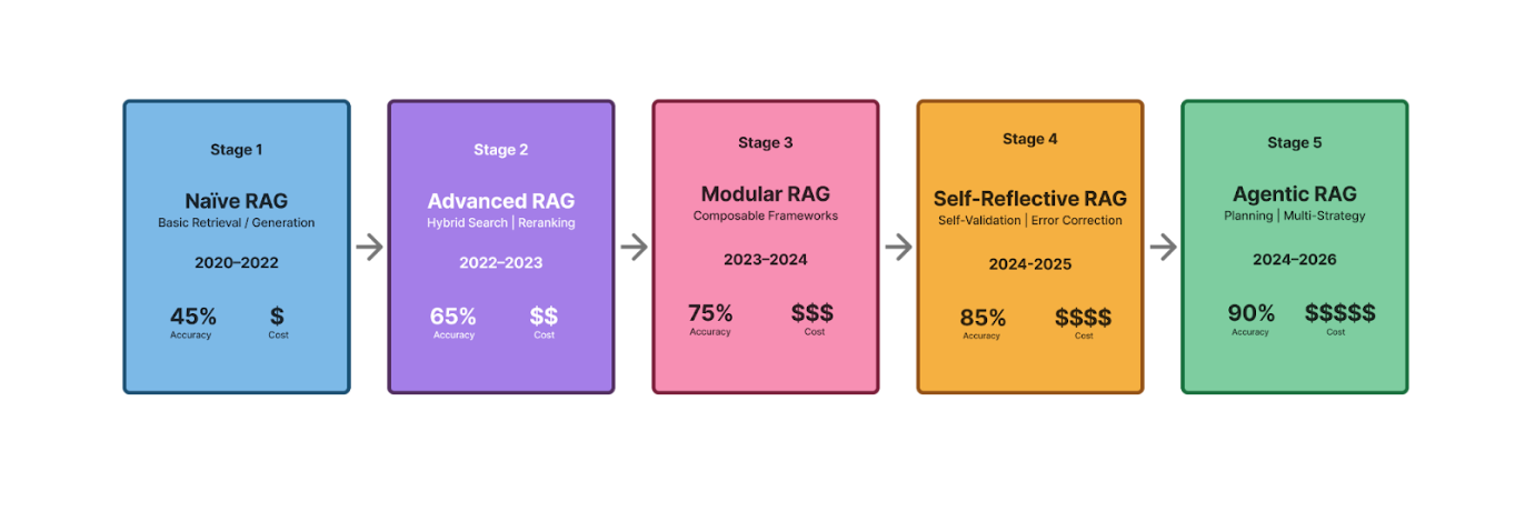 By 2022–2023, advanced RAG emerged, introducing hybrid retrieval strategies that combined dense and sparse search, reranking, and query expansion. These advances yielded measurable accuracy gains (up to 80%) but also introduced greater implementation complexity.